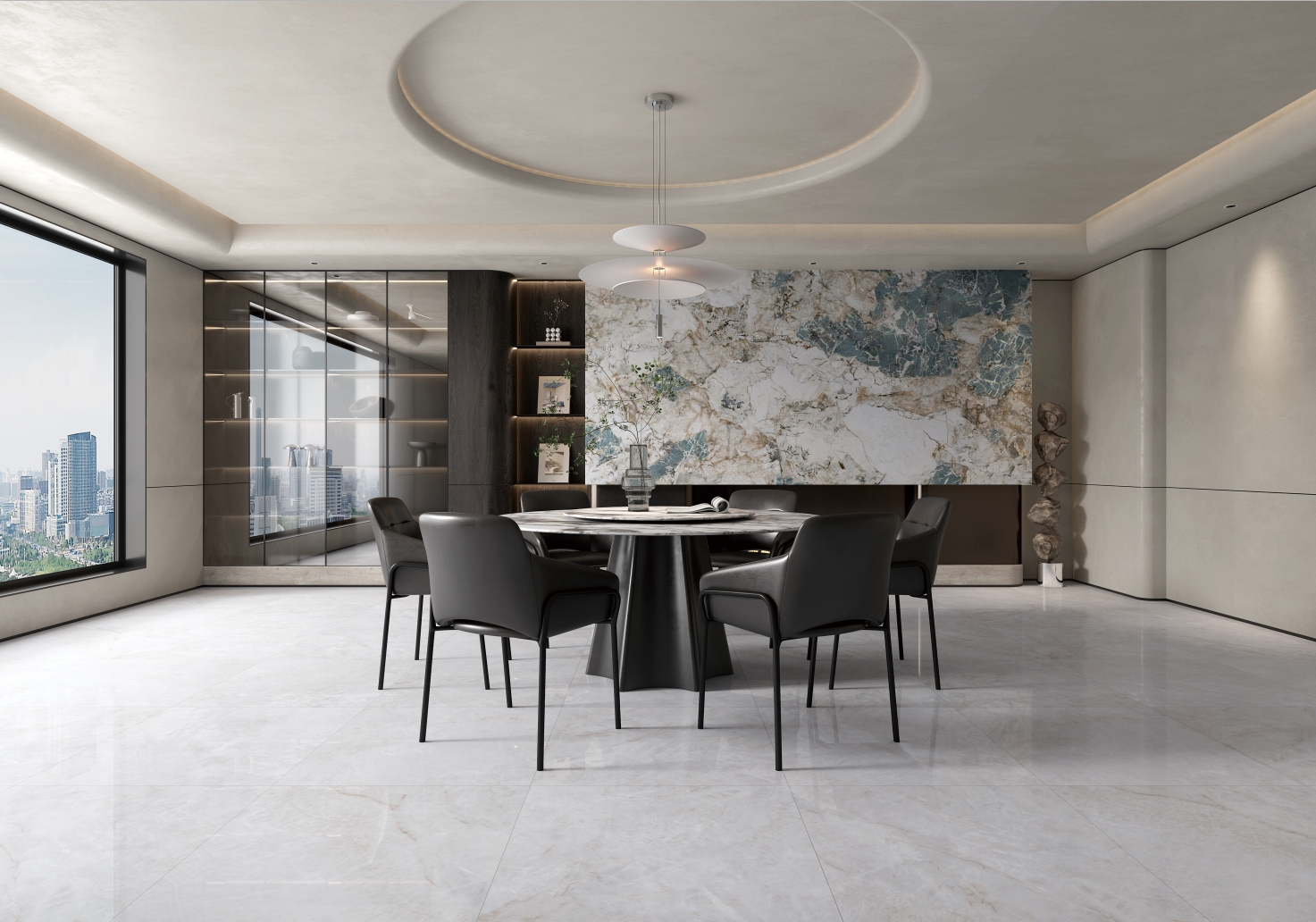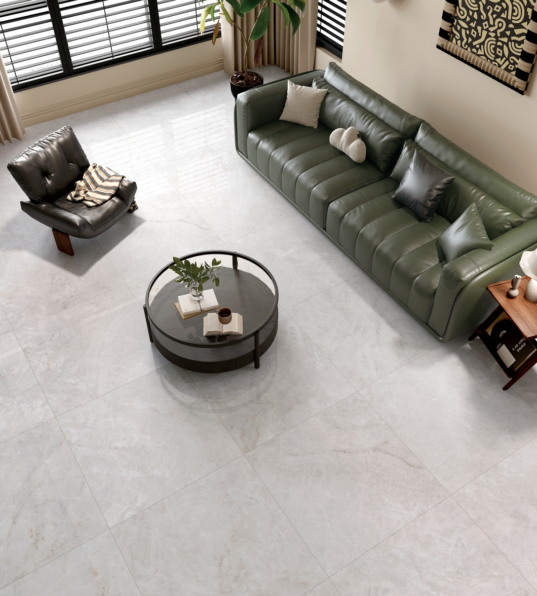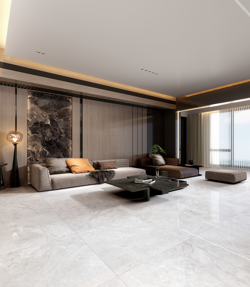 銀灰色的磚面上附著這大片絮狀紋理,形成了絢麗的銀灰色版面,猶如云母貝獨特的生長紋,高透柔美的玉質(zhì)凝脂感和均勻的質(zhì)地,在光線照射下泛起溫婉細膩的虹彩。