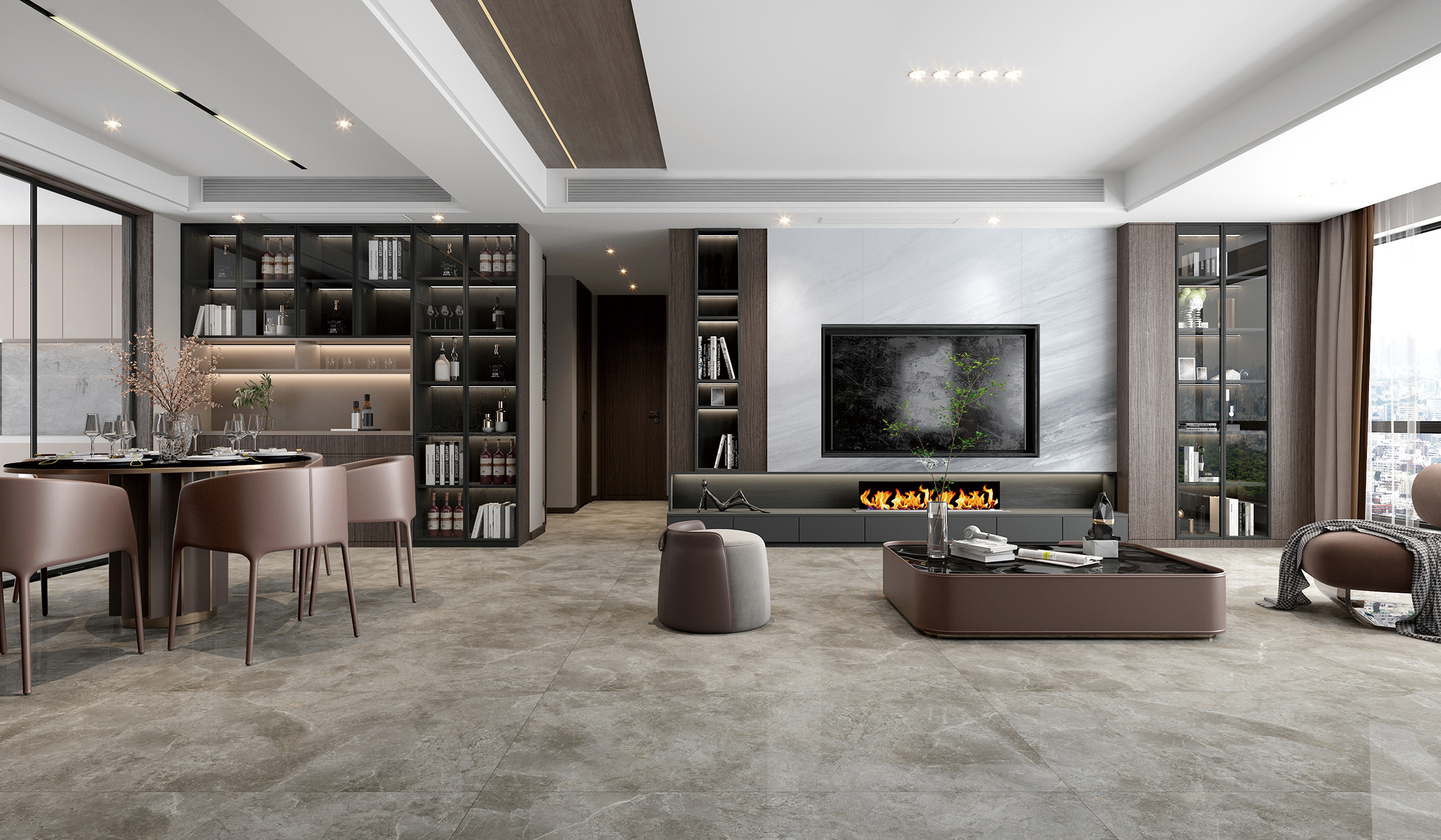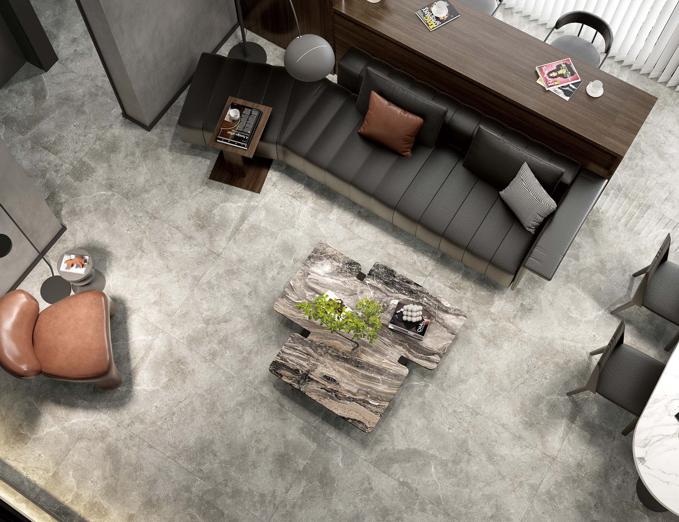 卡基諾灰,遍布粗糲的原石顆粒,層次立現(xiàn),承載悠遠時光感的黑色細紋在磚的表面盛放,訴說著大理石億萬年自然演變的原始記憶。一石滿足多種應(yīng)用需求,即可以高調(diào)奢華也可以低調(diào)優(yōu)雅,裝點出簡約時尚的生活空間。